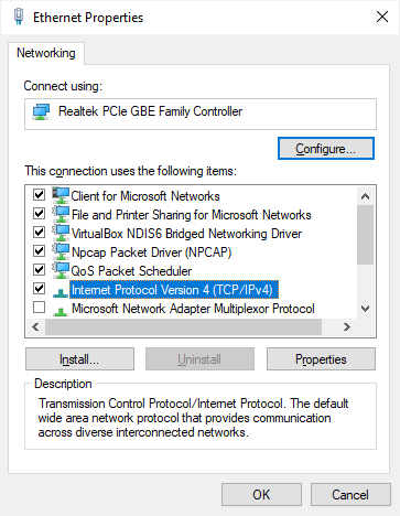 To set the PC IP Address in Windows 10 go to Control Panel | Network and Sharing | Change Adapter Settings | Right click - Ethernet | Properties | Select Internet Protocol Version 4 (TCP/IPv4):