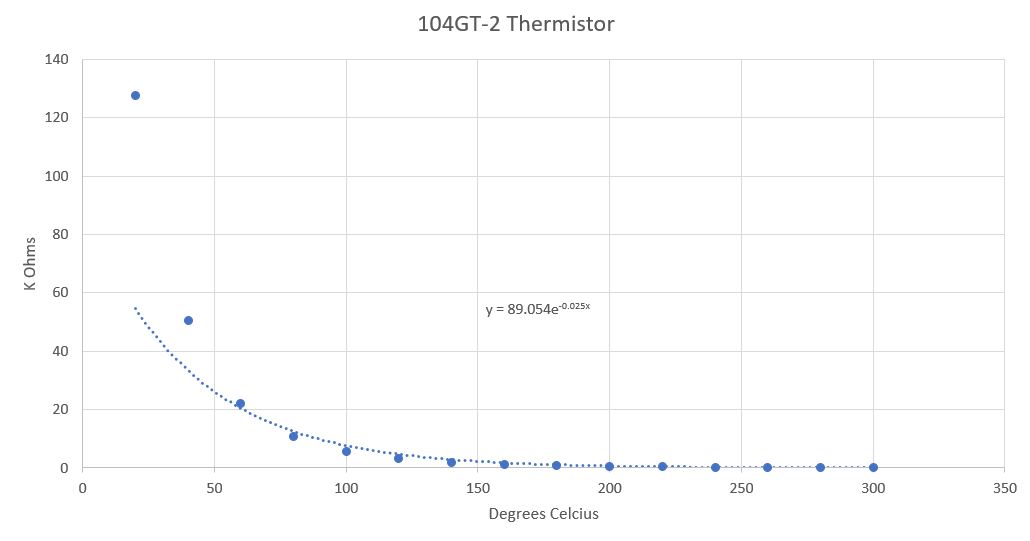 The 3D printer I am making needs to be able to handle temperatures close to 300 (475 F) degrees C. So I will need to use a different function to convert temp to ADC. Here is the one I am trying to use(part number 104GT-2) sold on Amazon, rated to 300 degrees C.