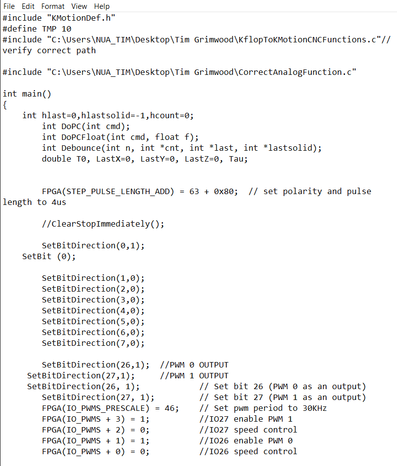C Program Changes: Carl helped me load C program changes that should allow for spindle control via the KFLOP board, but I don't really understand enough here to know what my current set up is. We couldn't get it to work. I do recall seeing some code that was reminiscent of the SpindlePWM.c example code in the examples files though. I've attached a picture of the section that I believe was modified, though there may have been other code added elsewhere.