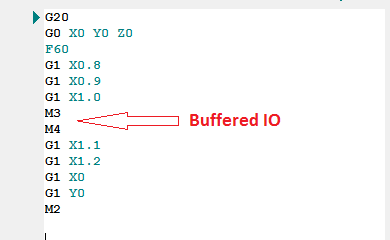 In addition to embedding outputs into the motion stream, waits for inputs can be embedded. This is inserted as a buffered WaitBitBuf command. When executed if the specified bit is false the motion will stall at that point until the input becomes true. There is a similar command WaitNotBitBuf that will stall until the input becomes false. MCodes can be configure to insert these commands, Although Wait commands can be inserted anywhere in a motion path it normally is only useful to place them at locations where the motion stops. Such as the very beginning of a path or at a corner where motion comes to a stop. Otherwise an instantaneous stop will occur without any acceleration. Wait commands are useful when motion must proceed instantly on command. This is possible because the motion has already been Interpreted, planned, downloaded, and commanded to execute ahead of time. See the example GCode below where a wait has been inserted at a corner.