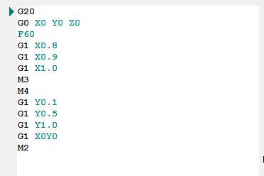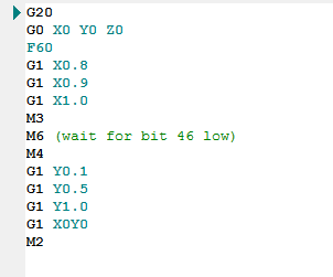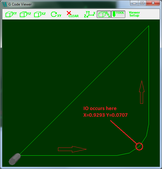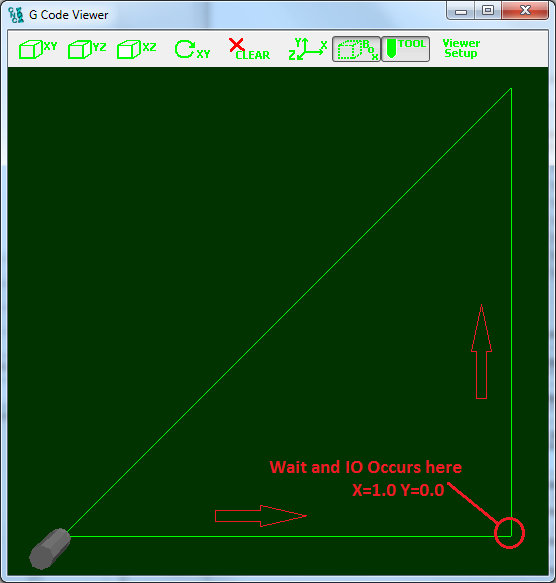 The GCode below demonstrates a right-triangle motion path with the I/O commands inserted at a corner.