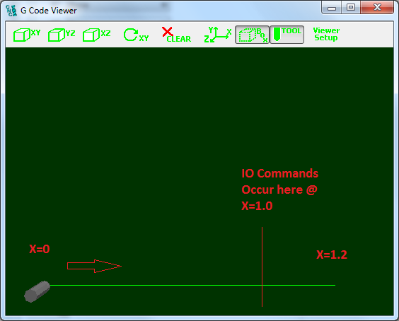 Executing the GCode we can observe the IO bits 46 and 67 set high as the motion crosses X=1.0