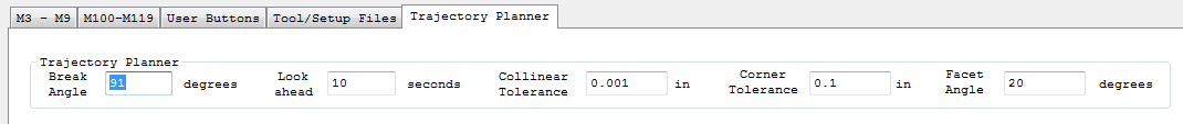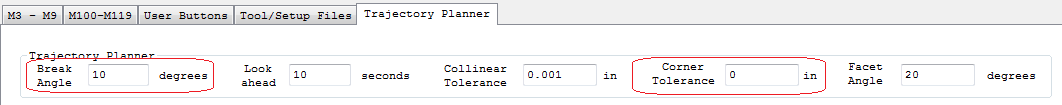 To demonstrate what happens with corner rounding an exaggerated corner rounding example is shown below. With a Break Angle greater than 90 degrees a stop will not occur at the corner. Also a large radius (0.1 inches) and large facet angle (20 degrees) corner rounding is configured.