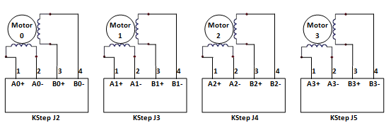 Motors can be wired into connectors J2 through J5 on KStep according to the following diagram: