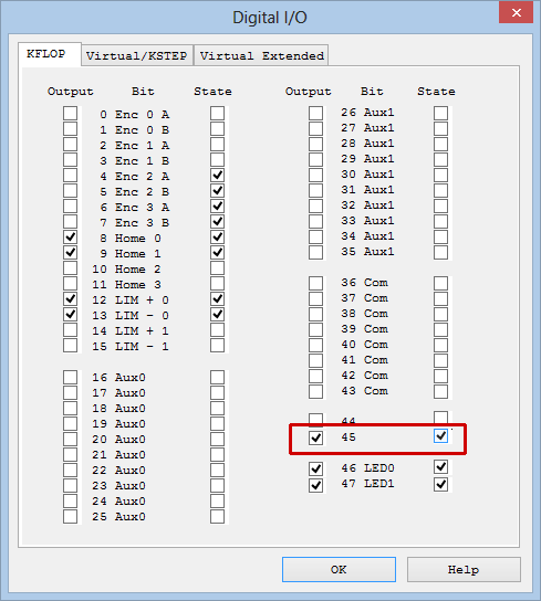 To do this, while the KStep LED D1 MOT PWR is illuminated, open KMotion.exe, select the Digital IO Screen, Set IO bit 45 as Output (enable the checkbox to the left of bit 45), Set IO 45 State to On (enable the checkbox to the right of bit 45). Verify that the KStep D3 ENABLE LED illuminates and that your motors hold position against a torque - in other words, you cannot move the motor shaft with your fingers. In this state, the motors will become warm and may become too hot to touch.
