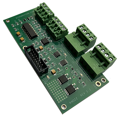 CNC Application Note: KNozz may also be used in CNC Applications to provide an isolated analog Spindle Speed Output, two isolated switches for Spindle On/Off/Direction Control, and 2 analog inputs for FRO and SSO potentiometer inputs.