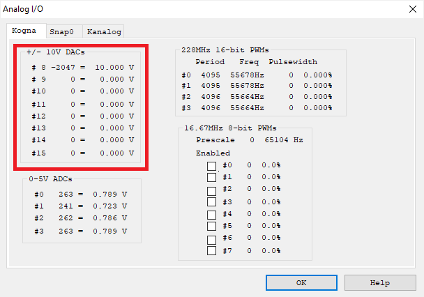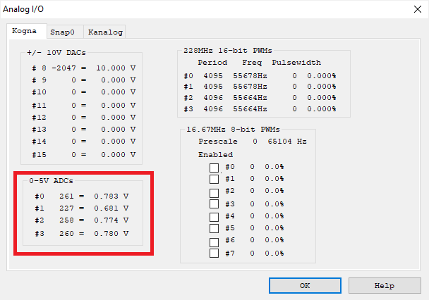 The current ADC readings are displayed on the Analog Status Screen shown below marked in red. The DACs have ~11-bit resolution where 2047 counts correspond to 6.144V, however the inputs have protection diodes to the +5V supply and can not be driven above ~5.5V. All ADCs update every 1620us.