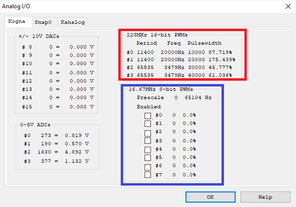 The original (8) 8-bit 16.67 MHz PWMs, Prescale, and enables are also displayed. When enabled the PWM drives the JP6 Pin otherwise it can be used as a GPIO pins (IO Bits 26 - 33). See Analog Status Screen as shown in blue below.