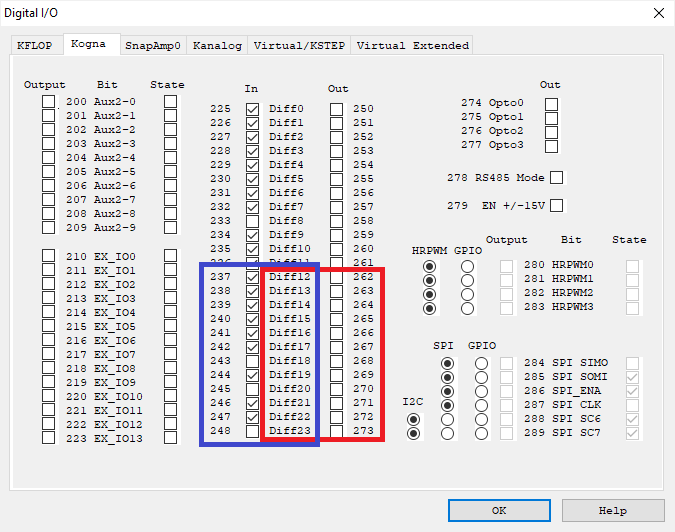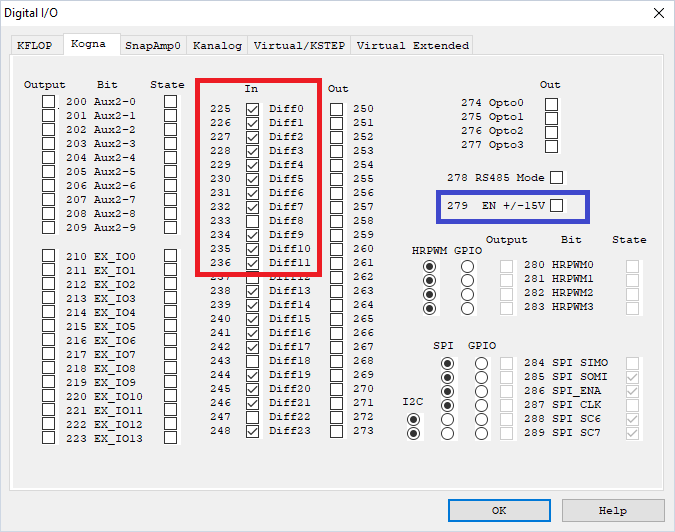 JP8 contains the first half of Kogna's 5V differential inputs (JP14 contains the other half). Enough for 6 A/B quadrature encoders inputs. See Kogna's Encoders for more information. Each encoder has an an A and B input where each A and B input has a + and - input pin. When the + pin is at a higher voltage than the - pin then the input is high. When the + pin is at a lower voltage than the - pin the input is low. The + and - pins have a moderate termination resistance of 470 Ohms. Both the + and - pins must be driven for the input to work properly (neither can be left unconnected). The differential inputs may also read as 12 General Inputs as IO Bits 225 - 236 and displayed on the Digital IO Screen as shown in red below: