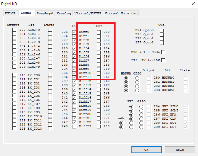 If the associated Step/Direction channel is not enabled the differential outputs may be used as 12 General Outputs as IO Bits 262 - 273. The current state can be toggled from the Digital IO Screen as well as the last commanded state displayed as shown in red below: