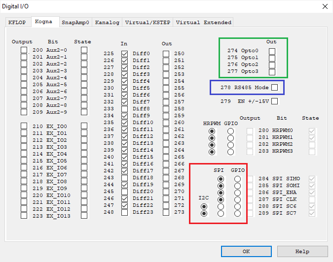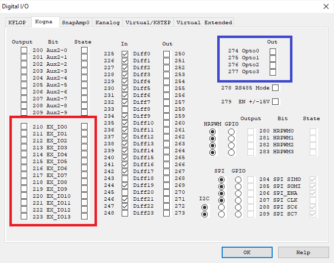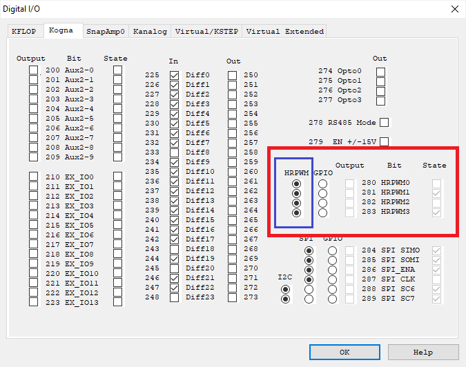The current HRPWM state is displayed on the Digital IO Screen as shown below in red. These 4 3.3V LVTTL connector pins can be configured as HRPWMs or GPIO (inputs or outputs) IO Bits 280-283. In the Screen below they are shown to be HRPWM mode as shown in blue. The GPIO have fast access times as they are directly connected to Kogna's DSP.