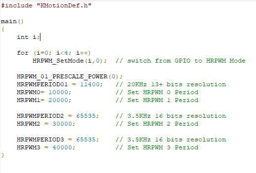 JP10 also contains Kogna's 4 High-Resolution PWMS. Because these are clocked at 228MHz they are able operate at 12-bits of resolution at 55.7KHz. The example below shows how the connector pins can be set to HRPWM mode, and how the Period and and Pulse length can be set. HRPWMs #0 and #1 have a common binary prescaler (divide by 2 ^ N) and a common Period. HRPWMs #2 and #3 do not have a prescale and have independent Period registers. This example is included as HRPWM Example.c.