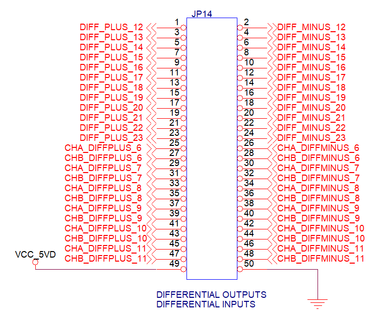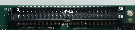 JP14 contains the second half of Kogna's 5V differential outputs (JP10 contains the other half). Enough for 6 Axes of Step/Direction being driven with a Differential Driver. Step/Direction Generators #6 - #11 can be configured to drive pins on JP14. See Kogna's Step/Direction for more information. Each Step/Direction Generator has a Step and Direction Output where each Step and Direction output each has a + and - output pin. When the signal is high the + pin is driven near 5V and the - pin is driven near 0V. When the signal is low the + pin is driven near 0V and the - pin is driven near 5V.