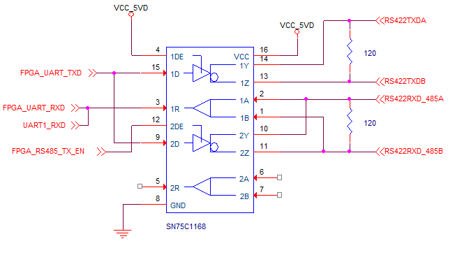 JP12 also contains 5V differential signals interfaced to Kogna's hardware UART that operates up to 1.5Mbaud. 4 pins provide RS422/RS485 support with 5V differential Transmit and Receive signals. In RS422 mode 2 pins are used for the differential Transmit signal and 2 pins are used for the differential receive signal. In RS485 mode both Transmit and Receive operate on the same 2 pins (the other 2 pins are not used). Kogna's FPGA provides automatic output drive enable when in RS485 mode. Both differential pin pairs have 120 Ohm termination. See the circuit diagram below.