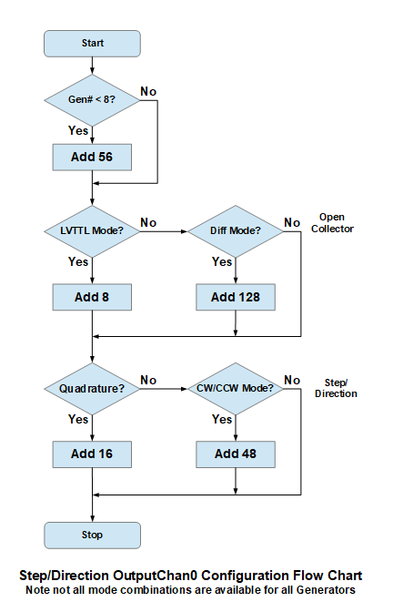 Adding 48 to the channel number switches the generator from Step/Dir to CW/CCW output mode.