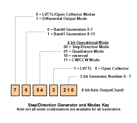 Axis output channel settings 0-255 are allowed for Kogna. Although only 16 Step and Direction generators are available for Kogna. By adding specific constants to the channel number the operation mode and output mode of each Step/Dir Generator can be changed independently. Not all Output Drive modes are valid for all Generators.