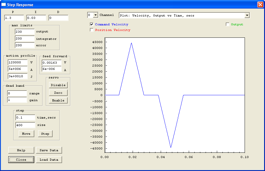 To perform a measurement and display the response, select the time duration to gather data, and the move or step size to perform, and press either the Move or Step buttons. If the axis is currently enabled, it will be disabled, all parameters from all screens will be downloaded, the axis will be enabled, the move or step will be performed while the data is gathered, the data will then be uploaded and plotted.