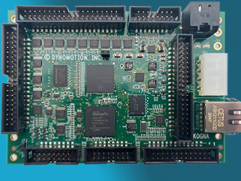 Dynomotion's Kogna card combines a 2.7 GFLOP DSP (TMS320C6748), FPGA, Ethernet, USB, and a PC-based development environment to create a versatile and programmable motion solution. Designed for up to 16-axes control, Kogna provides advanced control for torque, speed, and position for any mix of stepper, DC brushless, and DC brush motors. Kogna uses flash memory to store and run multiple-thread compiled C code on a 2.7 GFLOP processor with native 64-bit floating point support for stand-alone operation. A PC connected with an Ethernet cable can be used for control and monitoring.