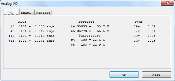 Состояние 4 каналов ШИМ (широтно-импульсной модуляции) платы расширения SnapAmp's показывается в правой части окна состояния. Выходы ШИМ подключены к полномостовым драйверам, чтобы обеспечить полный контроль различных двигателей и нагрузок. Смотрите соответствующий раздел справки. Каналы ШИМ могут работать независимо друг от друга. Полномостовая схема позволяет подключать 4-х фазные шаговые двигатели, а так же 3-х фазные двигатели.