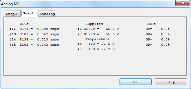 Так как плата KFLOP не работает с аналоговыми сигналами без подключения плат расширения, без них эти данные выводиться не будут. При подключении нескольких плат SnapAmp, для каждой будет создана своя вкладка с параметрами (Snap0, Snap1 и т.д.). Для отображения параметров платы расширения Kanalog в верхнем меню установите соответствующий флажок.
