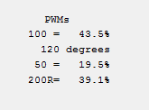 Каналы ШИМ могут также работать в режиме токовой петли. В этом режиме значение ШИМ автоматически регулируется для того, чтобы поддерживать заданный ток. Будет показано значение ШИМ в диапазоне -4095..+4095, с дополнительной буквой "С" и в процентном соотношении.
