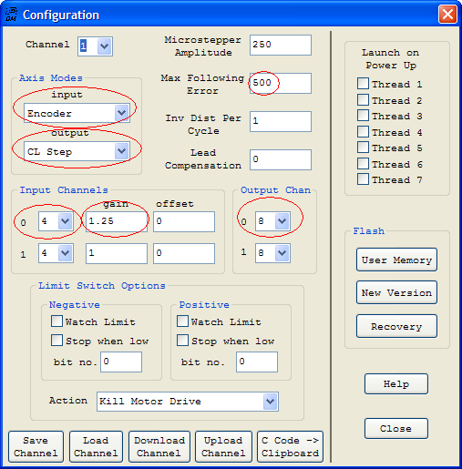 Note that an Input gain of 1.25 is used in this example. This was calculated from the ratio of the number of μSteps/rev to the number of encoder counts/rev. (A micro stepper amplifier set to 50 microsteps/full setp and a standard stepper motor with 200 full steps/rev will have 10,000 μSteps/rev, a rotary encoder with 2000 lines/rev will profuce 8000 quadrature counts/rev, 10000/8000 = 1.25). The raw axis units will be in μSteps.
