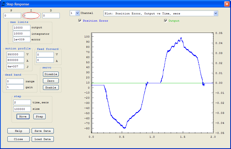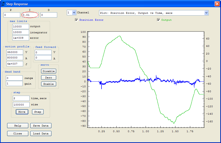 Important PID parameters are shown below circled in red. The I (Integrator) gain of 0.01 is probably the most important. Your system may require more or less. Too much and the system may over shoot or become unstable (oscillate). Too little and corrections will be made slowly. Because we are measure the position and also commanding a position Integrator control works well. An integrator will ramp the output at a rate proportional to the amount of the error. This "slowing as we get closer" will result in an exponential curve approaching the target. Backlash, friction, delays, and other factors will eventually cause the system to overshoot and become unstable with too much gain.