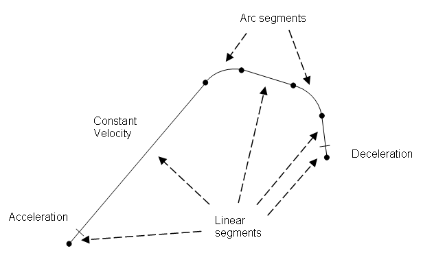 Path segments are downloaded into a buffer within the KMotion board. This buffer is called the Coordinated Motion Buffer and may contain up to MAX_SEGMENTS (40,000) motion segments. Segments are defined by a linear or circular path as well as a parametric equation (3rd order) which describes the motion along the path as a function of time. Often the same path may be defined in the several segments in order to utilize different parametric equations for different sections of the path. As shown above, one section of a path might undergo acceleration while another section of a path might maintain constant velocity. Buffered I/O Bit Commands (SetBitBuf, ClearBitBuf, or SetStateBitBuf) may also be downloaded into the buffer before, after, or between segments. This allows I/O to occur (i.e. switching on or off a LASER) at exact times while the motion is being performed. Virtual I/O bits may also be set or cleared to trigger other programs to perform customized functions.