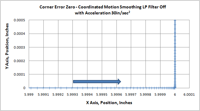 Недостатком, связанным с фильтрацией нижних частот, является потенциальное отставание в командных позициях, которое может вызывать небольшие ошибки пути. Графики, показанные ниже, показывают, что для большинства систем значение фильтра нижних частот 1мс будет незначительным. Ниже показан почти худший случай - 90 градусов с максимальным замедлением по оси X с последующим максимальным ускорением на оси Y.