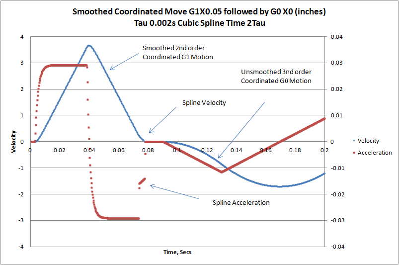 Поскольку сглаживание нижних частот вводит небольшую задержку позиции, самый конец сглаженного пути не будет завершен при завершении скоординированного пути. Для завершения пути конечное положение и скорость каждой из скоординированных осей используются для вычисления кубического сплайна для завершения последнего малого движения. Кубический сплайн позволяет поддерживать стабильную скорость от конца сглаженного пути до конечного положения таким образом, что скорость также достигает нуля в целевом положении. Продолжительность времени кубического сплайна, установленного в 2xTau фильтра нижних частот, обеспечивает относительно постоянное замедление до цели.
