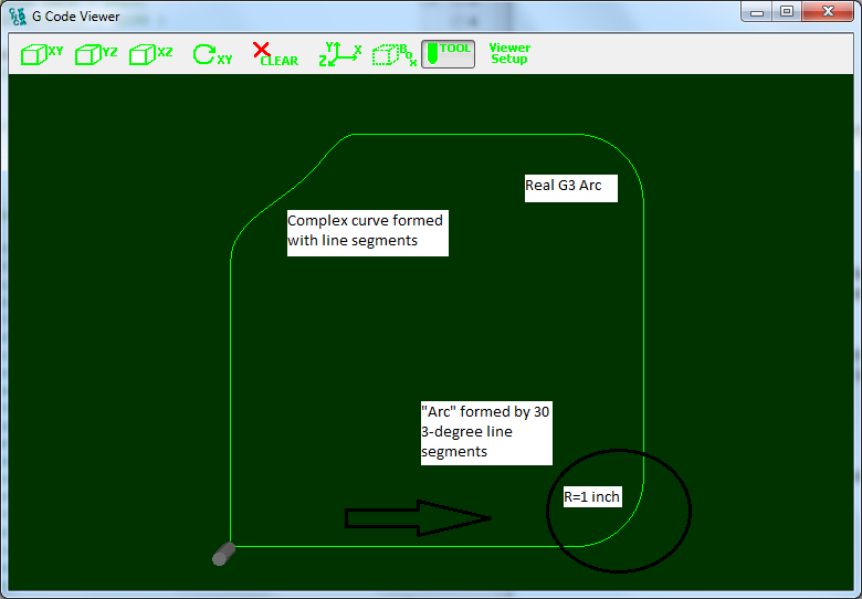 Ниже показан пример траектории, где нижняя правая дуга образована 30 отрезками. Обычно в G-коде указывается простая дуга, но для проверки она создана с 30 углами в 3 градуса, образующими поворот на 90 градусов. Ниже проведены тесты, имитирующие достаточно высокую производительность системы с ускорением 30 дюймов/сек2. Используемый G-код можно загрузить здесь.