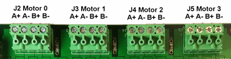 2F. Wiring Motors to KSTEPStepper motors come in a variety of wiring configurations from 4 to 8 wires. KSTEP only needs 4 of these to drive a stepper since KSTEP does not require the center tap wires. KSTEP requires only the full bridge coils to drive the stepper and you can ignore center tap wires if your motor has them. For 8-wire steppers, you have a choice about how to wire them, in series or in parallel and would need to choose the power supply to fit the wiring method.There are many resources on the web that describes Stepper motor wiring so we will not address the specifics here, but essentially you need only to wire in the coils across the "+" and "-" of the motor power output of KSTEP. Warning: you can damage KSTEP if you wire the motors incorrectly make sure to measure the resistance between coils and that you have identified your coils properly before wiring into KSTEP. It is vitally important that each coil is wired into KSTEP properly. Motors can be wired into connectors J2 through J5 on KSTEP according to the following diagram: