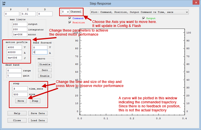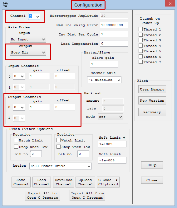 3B. Setting Axis/Channel Parameters and Running an Initialization C Program (Init)The goal in this section is to set the parameters that will ultimately go into the Init program. To do this, you will use two screens in KMotion: "Config & Flash" and "Step Response." If you plan to use an encoder for Closed-Loop Stepper Control, you would also use the "IIR Filters" screen as well, but it is not used for open-loop stepper control as described in this tutorial. You can view an explanation of how parameters are passed to/from KFLOP, loaded, saved and copied to C Programs here: http://dynomotion.com/Help/FlashHelp/Parameters/index.html.
