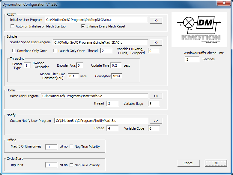 C Code to configure axis 0 might look like the code shown below. Detailed knowledge of C programming is not required to paste these into a User Program. The configuration for each axis should be pasted into a single program. Later this program may be executed at any time to completely configure the KMotion Board. The KMotion Executive program would not be needed to do this. The RESET button from within Mach3 will be configured to execute this program.