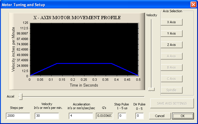Select Config|Motor Tuning to bring up the Motor Tuning Dialog. This screen allows the setting of Machine resolution, Max Velocity, and Max Acceleration for each axis in use. Note that the sliders are typically not very useful since the max step rates are much higher using a KMotion Motion Controller than with the original PC Generated Steps. It's usually best to just enter values directly into the cells.