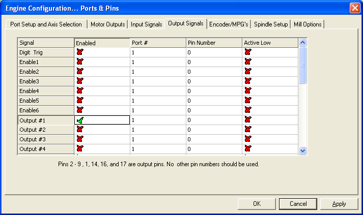 Mach3 typically defaults after an initial install with Output #1 enabled