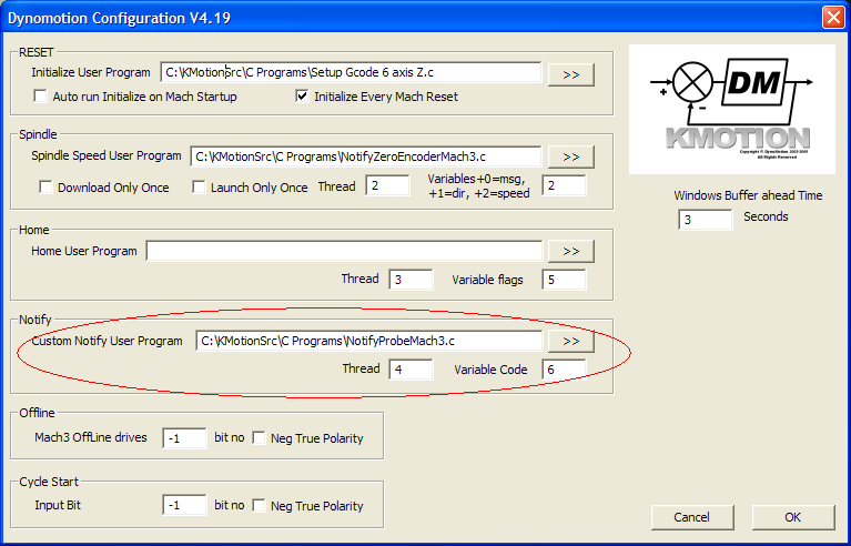 Add the message handler shown below to the Notify program for your system. During probing the DynoMotion Plugin sends a Notification 20000 message to the configured KMotion/KFlop Notify User Program.