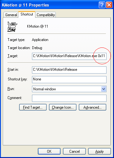 При запуске приложения KMotion можно указать адрес платы для подключения по умолчанию. Ниже показано, как создать ярлык с параметром запуска. Можно создать несколько ярлыков для запуска приложения для работы с разными платами.