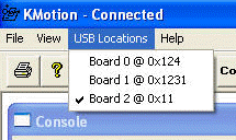 При выборе в меню "USB Locations" в приложении KMotion Setup and Tuning отобразится список всех подключенных в настоящее время плат KMotion. Флажок показывает, с какой платой в данный момент связано приложение. Чтобы переключиться на другую плату, выберите в списке нужный USB-адрес.