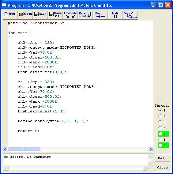 ![]() Окно ввода C программ позволяет компилировать, загружать в KFLOP, запускать, ставить выполнение на паузу программы на языке С. Программа С выполняется платой KFLOP, которая имеет контролирует все входа/выхода, движение и прочие различные функции системы KMotion. Одна из самых мощных функций системы KMotion является возможность компилировать и загружать собственные DSP программы в режиме реального времени.