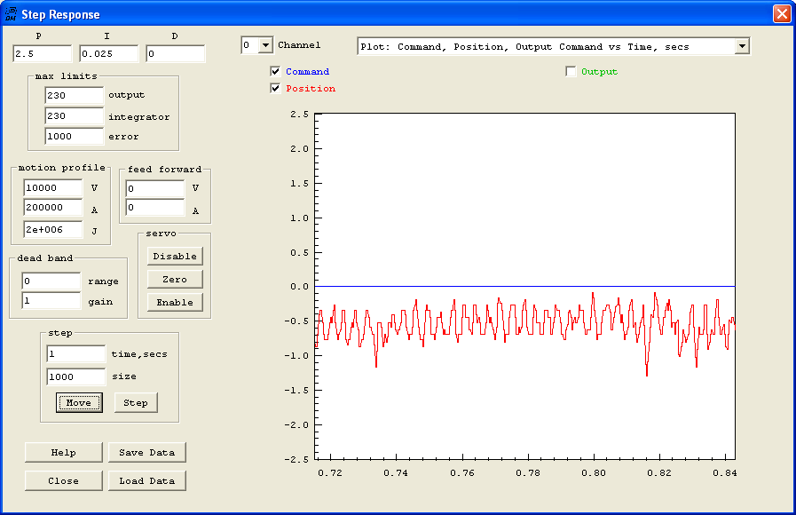 Zooming in on the position gives an indication of the position resolution and noise level. The signal shown below has a range of approximately +/- 0.5 counts where 1 count is 1/1000 of a shaft resolution. So for example on a system with a 5 pitch lead screw (0.200 inches / rev) this would correspond to +/- 0.1 mils (~ 2.5um).