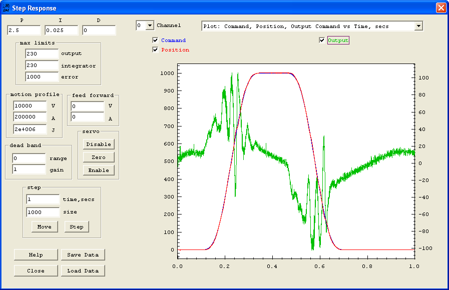 Here is a Move Plot of a move of 1000 which corresponds to 1 shaft revolution of the encoder. Not the Command (Blue) and Measured (Red) positions are nearly overlaid.