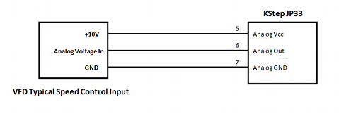 A 3.3V PWM output from KFLOP IO 44 JP7 pin 5 is normally connected to KStep JP36 Pin 5 to drive the PWM to Analog circuitry. Often a VFD will have 3 input terminals where a potentiometer can be connected as speed control. The three connections AnalogVcc, AnalogOut, and AnalogGnd can be connected to perform a similar function as a potentiometer. The AnalogOut voltage will vary from AnalogGnd to AnalogVcc voltage as a function of the PWM duty cycle.