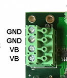 Motor power VBB from 12-48V may be applied through J1 or alternately through JR1. For applications that require more than 10A of supply current both of the GND and VBB connections should be used.
