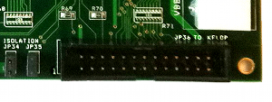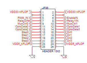 JP36 is designed to connect directly to KFLOP's JP7 in a 1:1 connection. KFLOP is then able to supply the 4 sets of Step/Dir signals, the Enable, the Analog PWM signal, the 2 Relay Driver outputs, and connections for the 16 opto inputs, as well as +5V (used if running without opto isolation). To conserved KFLOP IO pins the 16 opto inputs are read back in a multiplexed fashion 4 bits at a time where 2 outputs from KFLOP select which bank of 4 are currently selected. +3.3V is also provided to power the opto multiplexing circuitry.