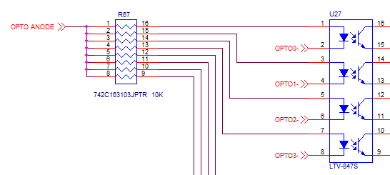 The input circuit for 4 of the 16 opto inputs is shown below. Note there is a common Anode for all 16 opto inputs which is normally tied to a +12 or +24V supply. Each of the negative opto pins are then switched to ground (return for the +12 or +24V supply)
