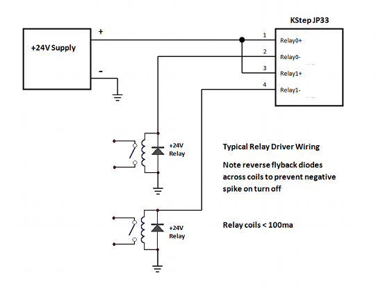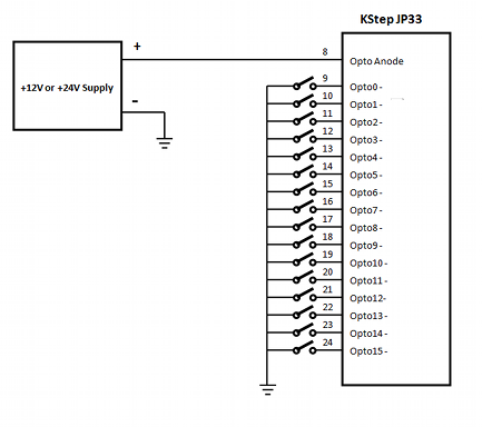 KStep adds 2 opto isolated relay drivers (100ma @ 36V), one Analog Output, and 16 opto isolated 12-24V inputs. All these IO are optically isolated regardless of the Isolation Jumpers set for the Isolation on the Step/Dir and enable signals. Opto Inputs have a common Anode normally connected to either +12V or +24V. Shorting any of the OPTO- pins to GND will activate the input. The Opto Inputs have a 10K ohm series resistance.