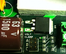 KStep features a jumper programmable Voltage Clamping Circuit. Voltage spikes due to Regenerative Braking and other sources can potentially raise the supply voltage up to a level that can damage electronics including KStep or the power supply. Voltage Spikes may also cause a power supply to trip a fault and shut down. KStep's Voltage clamp can be used to avoid these problems. KStep's Voltage Clamp can be programmed for 4 different voltage levels. It is not possible to disable the Voltage Clamp but the clamping voltage level may be changed. With all jumpers removed the Voltage will be clamped at 49V. Each jumper added will reduce the Clamping voltage by 12V. The order of the jumpers is not important as each reduces the Voltage by the same amount (12V). This allows common supply voltages of 12, 24, 36, and 48V to be used.