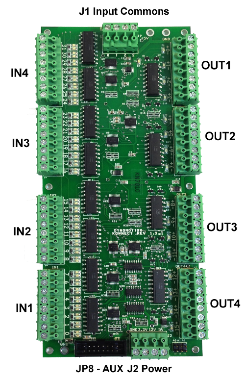The power signals from KFLOP's Aux Bus are available on the J2 terminals. It is not normally necessary to apply power to these terminals as power is supplied from KFLOP through the JP8 connector. For multiple boards it may be desirable to apply additional higher gauge power and GND connections between boards. Note the Signal labeled 12V is connected to the KFLOP 12V signal but may not be necessarily 12V. KFLOP and Konnect do not require or use the 12V signal but only pass the signal through the various connectors. Disk Drive Power Supplies usually supply +12V into KFLOP JR1 Pin 1. Also note that if any of these supply voltages are used for the Inputs or outputs then the Input wiring will not be isolated from KFLOP.