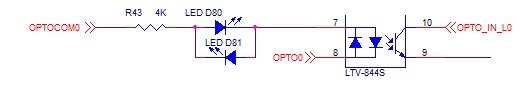 Konnect's 32 optically isolated inputs can be driven from a +/- 4.75V to a +/-25V signal. Less than 2V should be applied to ensure the input is off. One of the 32 input circuits is shown below. The input consists of a AC type of Optocoupler in series with an LED indicator in series with a 4Kohm resistor. The AC type of input allows the common to be connected to either the Positive or Negative Supply voltage so that either sinking or sourcing outputs can be used (current can flow either direction to activate the input).
